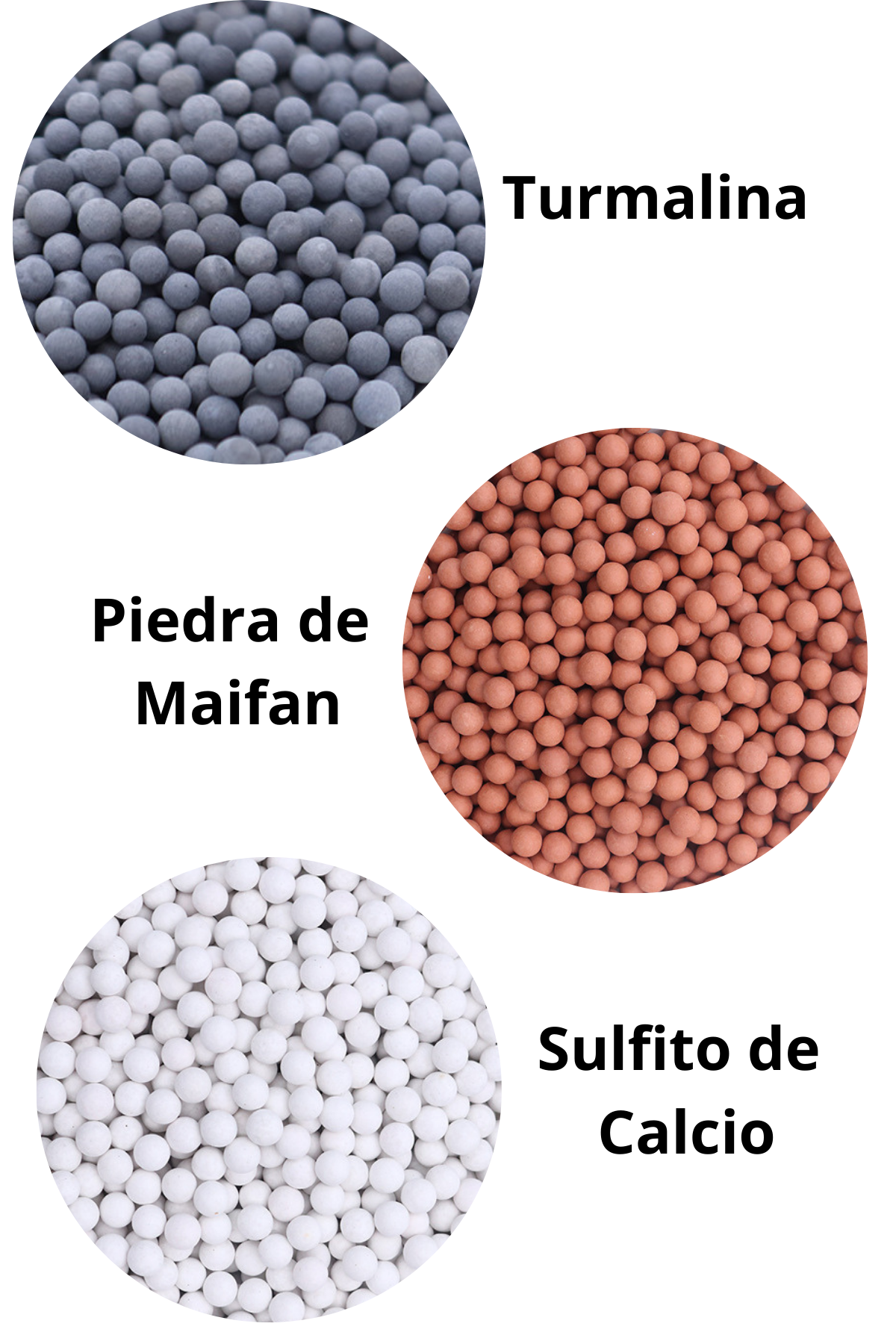 Filtra el agua de manera eficiente gracias a minerales de gran porosidad como la piedra de Maifan, la Turmalina y el Sulfito de Calcio.