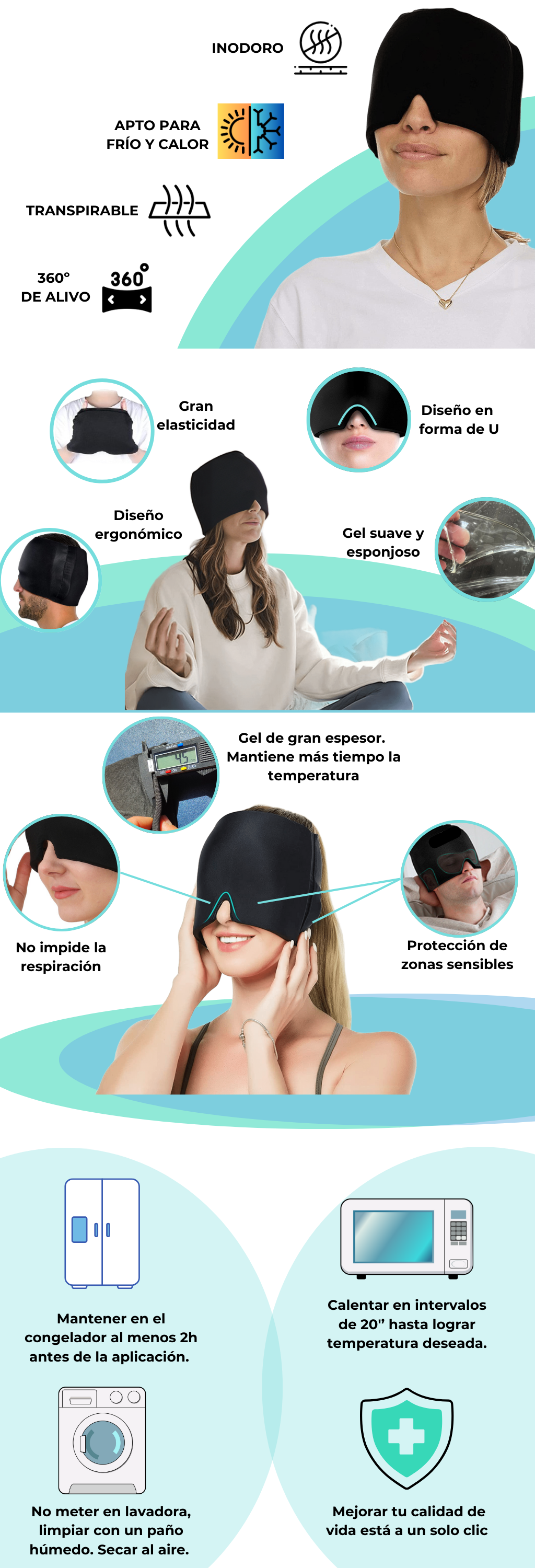 La máscara funciona utilizando terapia de frío para aliviar migrañas, reducir la hinchazón y proporcionar una sensación de frescura y relajación. Para usarla en frío, simplemente colócala en el congelador durante al menos 30 minutos antes de aplicarla en el área deseada.